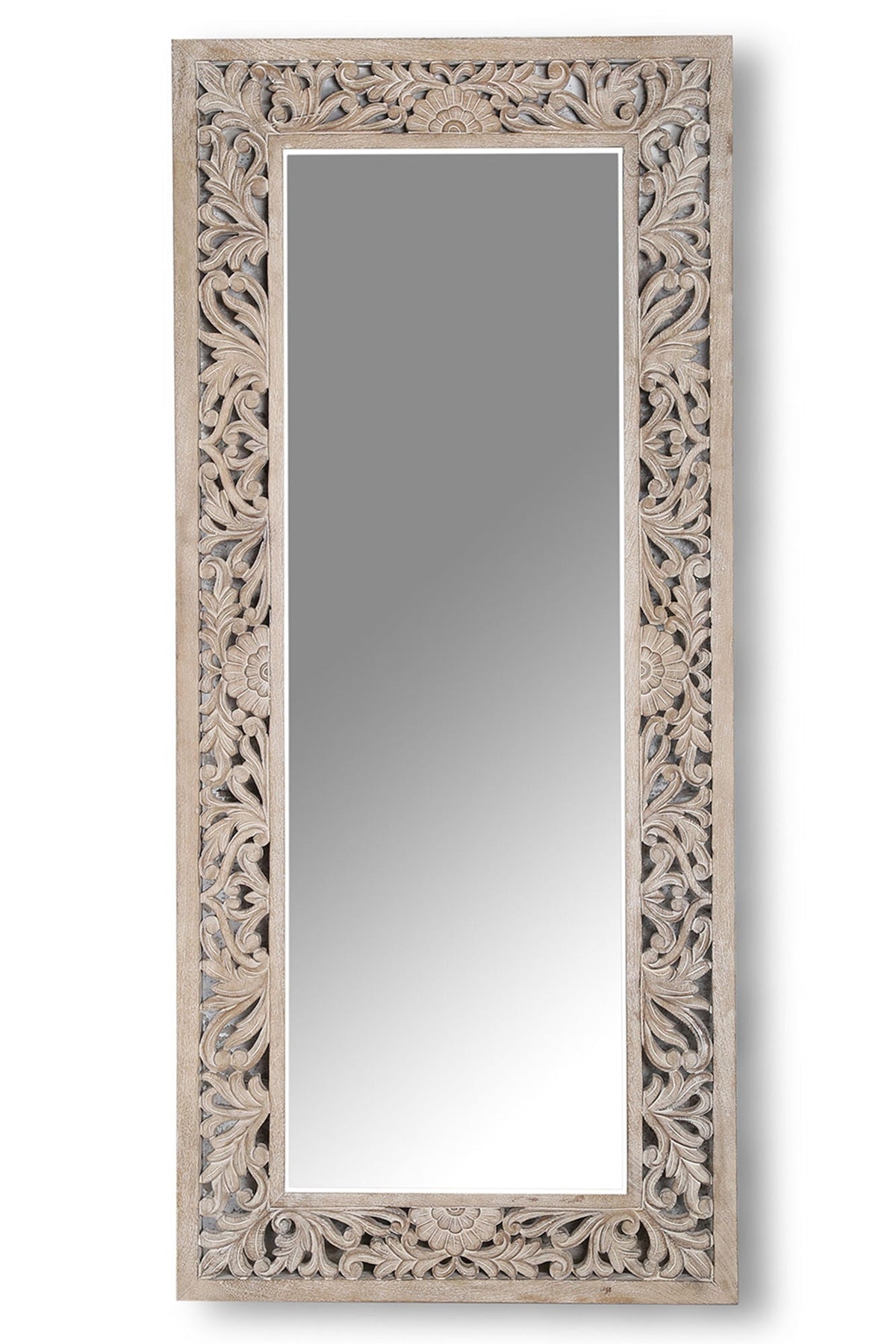 The hand-carved botanical and floral motif carvings add a touch of elegance and sophistication to this floor mirror. The sand-blasted, whitewashed finish over Mango solids creates a unique, rustic look that is sure to impress. The beveled mirror edge and modern French cleat wall hanging hardware make this mirror a functional and stylish piece in any room. Whether you are looking to create a focal point in your bedroom, living room, or entryway, this mirror is sure to make a statement.