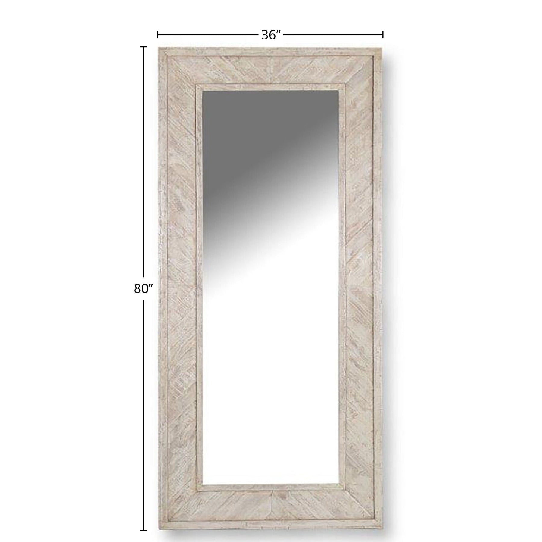 Large Rectangular Floor Mirror standing 80 inches high. Beveled edge mirror is framed effortlessly in a sandblasted Weathered Blanc finish that is inspired from the pristine surfaces of white pebbled sand.