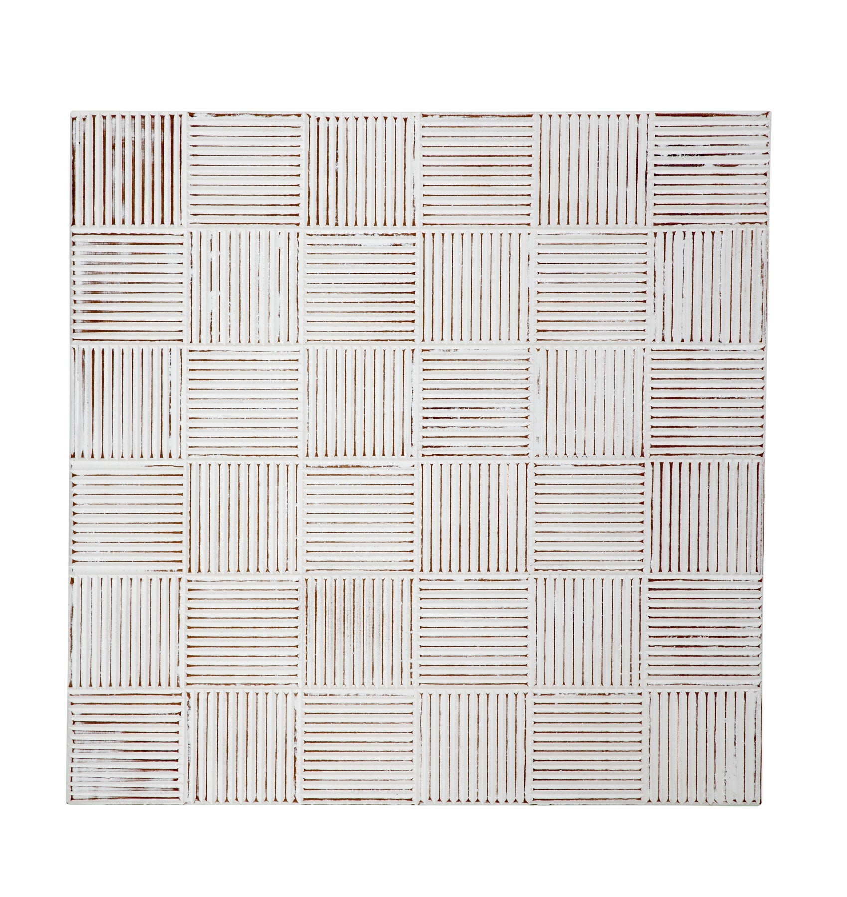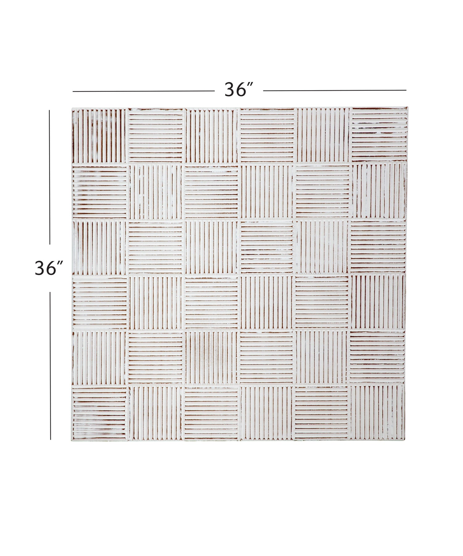 Malcom Wall Art is a wooden square wall hanging featuring a textured geometric pattern. D-ring or sawtooth picture hanging hardware included. Finish: Distressed White. Material: MDF. This piece of art is hand crafted by a skilled artist lending itself to a unique technique and will vary slightly. COO: IN.
