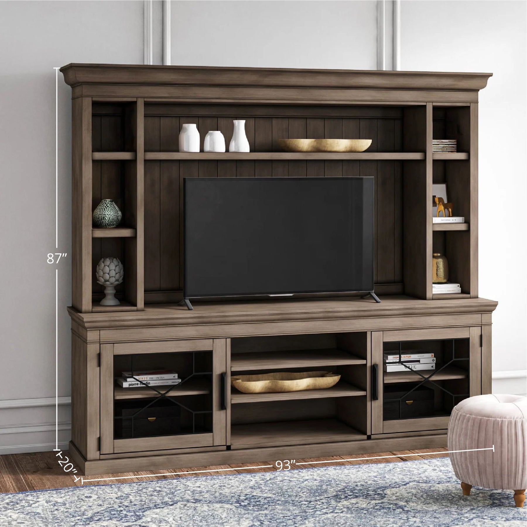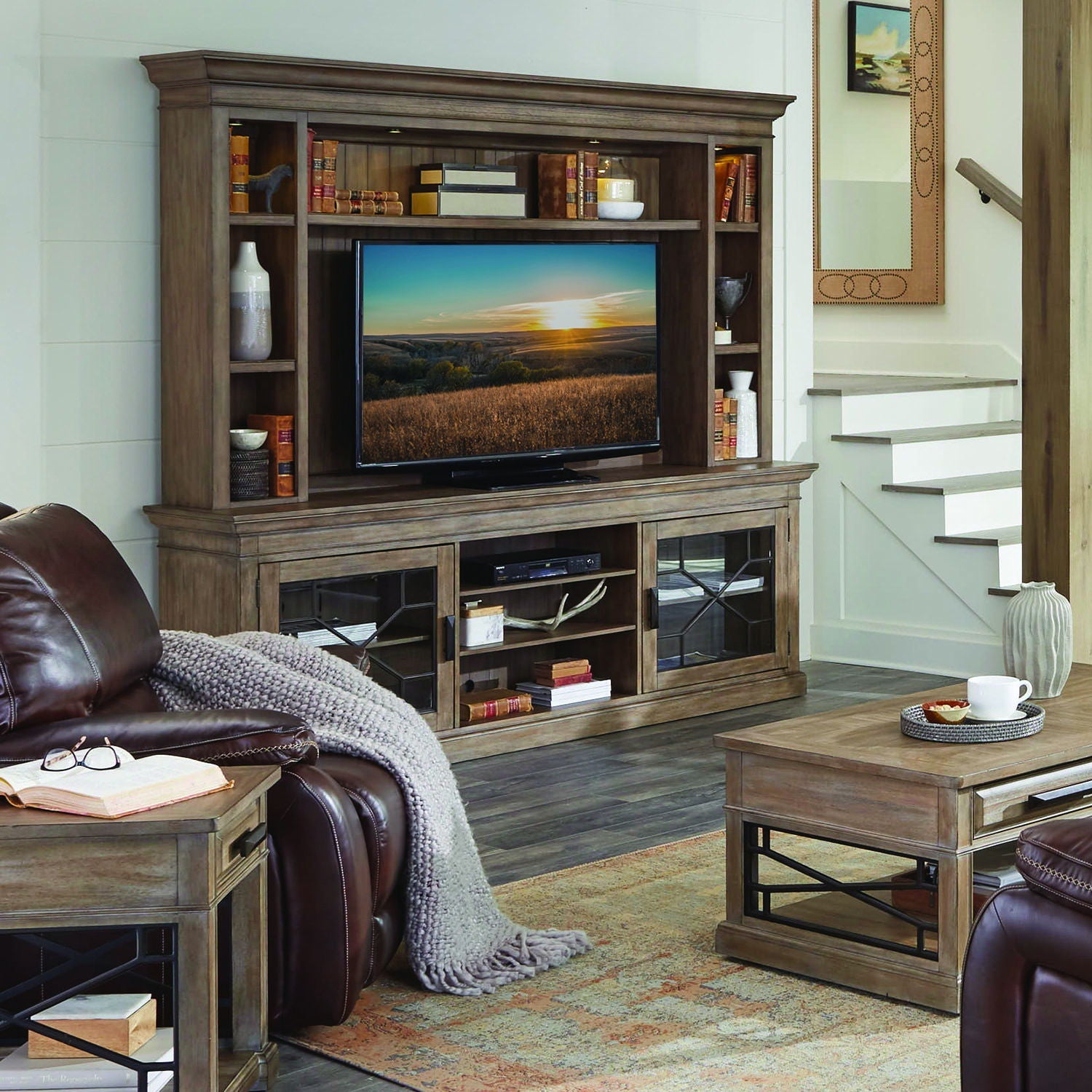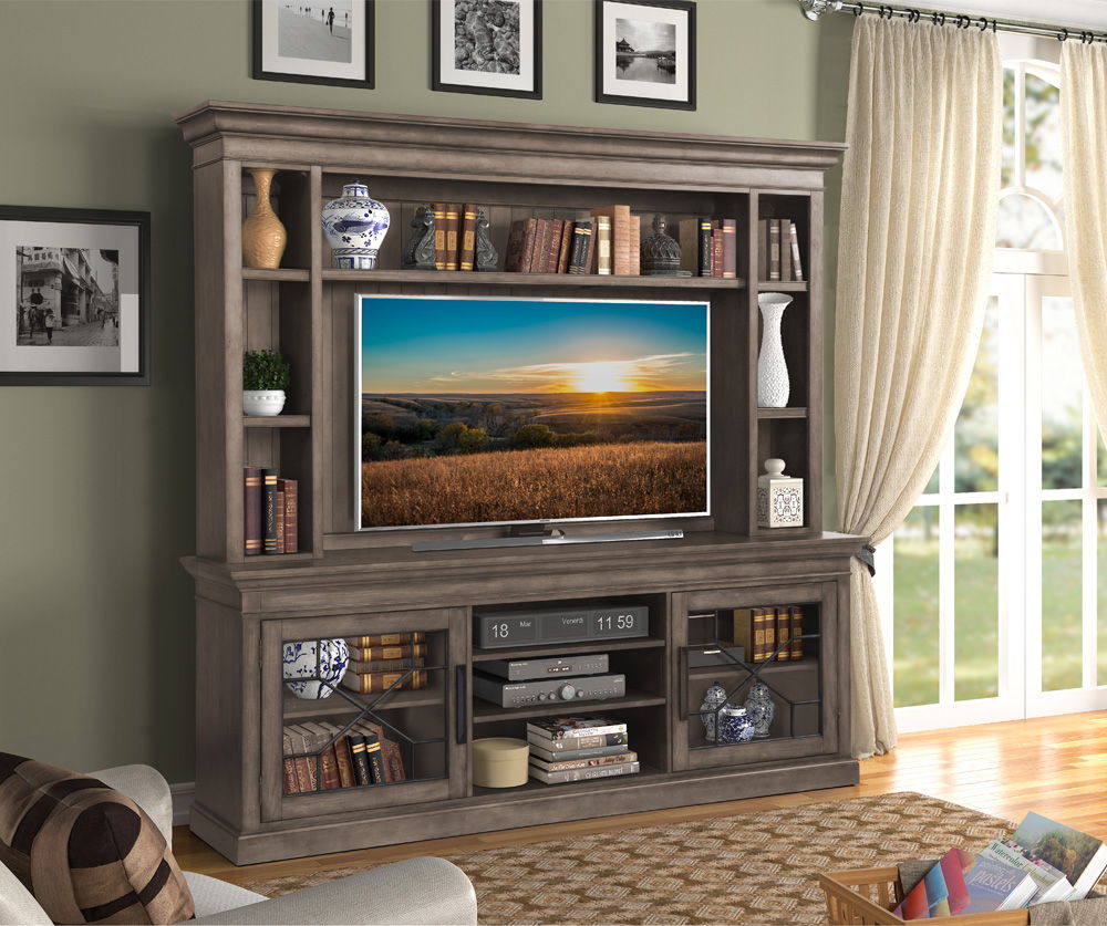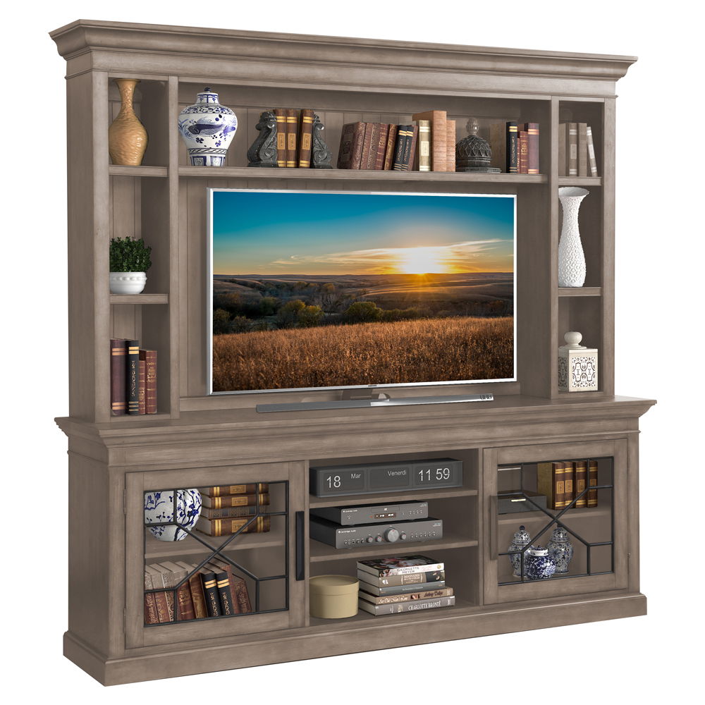 Rich with character, the Sundance collection's Console with Hutch and Backpanel makes a bold statement in style. Perfectly sized for televisions up to 92 inches, it offers storage, display and thoughtful functionality. Its handsome hand-applied, multi-step Sandstone finish complements any room's décor while conveying unique character. Energy-efficient LED lighting with a three-way touch dimmer button highlights the treasures and collectibles you display. A finished backpanel completes the look and adds impressive detailing. Two glass doors with decorative insets provide room for storage and display while three open center shelves are ideal for components. Inspired by the beauty of the great outdoors, this well-designed ensemble conveys modern rustic charm.