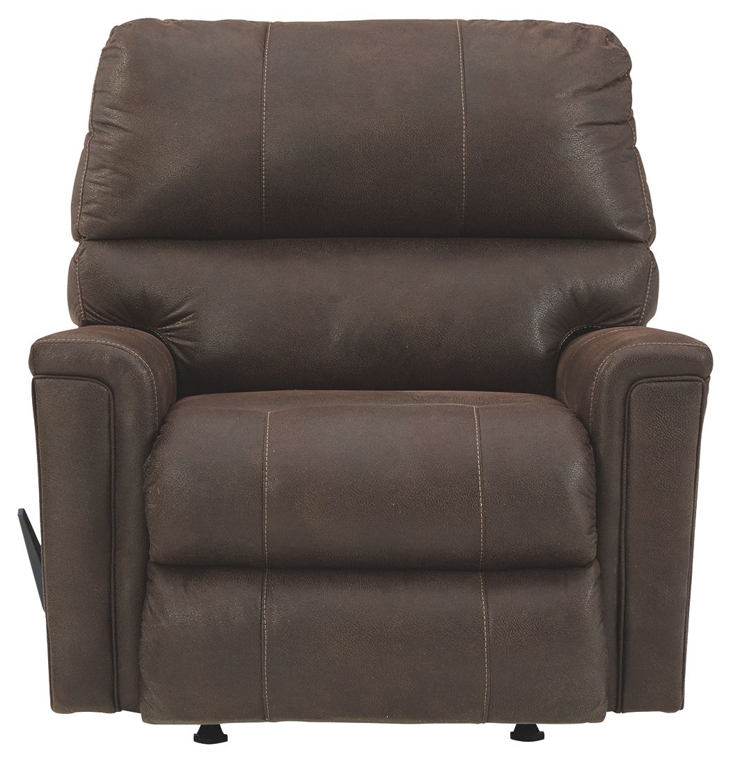 If you love the cool look of leather but long for the warm feel of fabric, you can take comfort in this rocker recliner. Wrapped in a fabulous faux leather with a weathered hue and hint of pebbly texture to resemble the real deal, this decidedly modern recliner proves less is more. Elements include angled side profiling and track armrests wrapped with a layer of pillowy softness for that little something extra. Prominent jumbo stitching and clean-lined divided back styling lend fashion-forward flair.