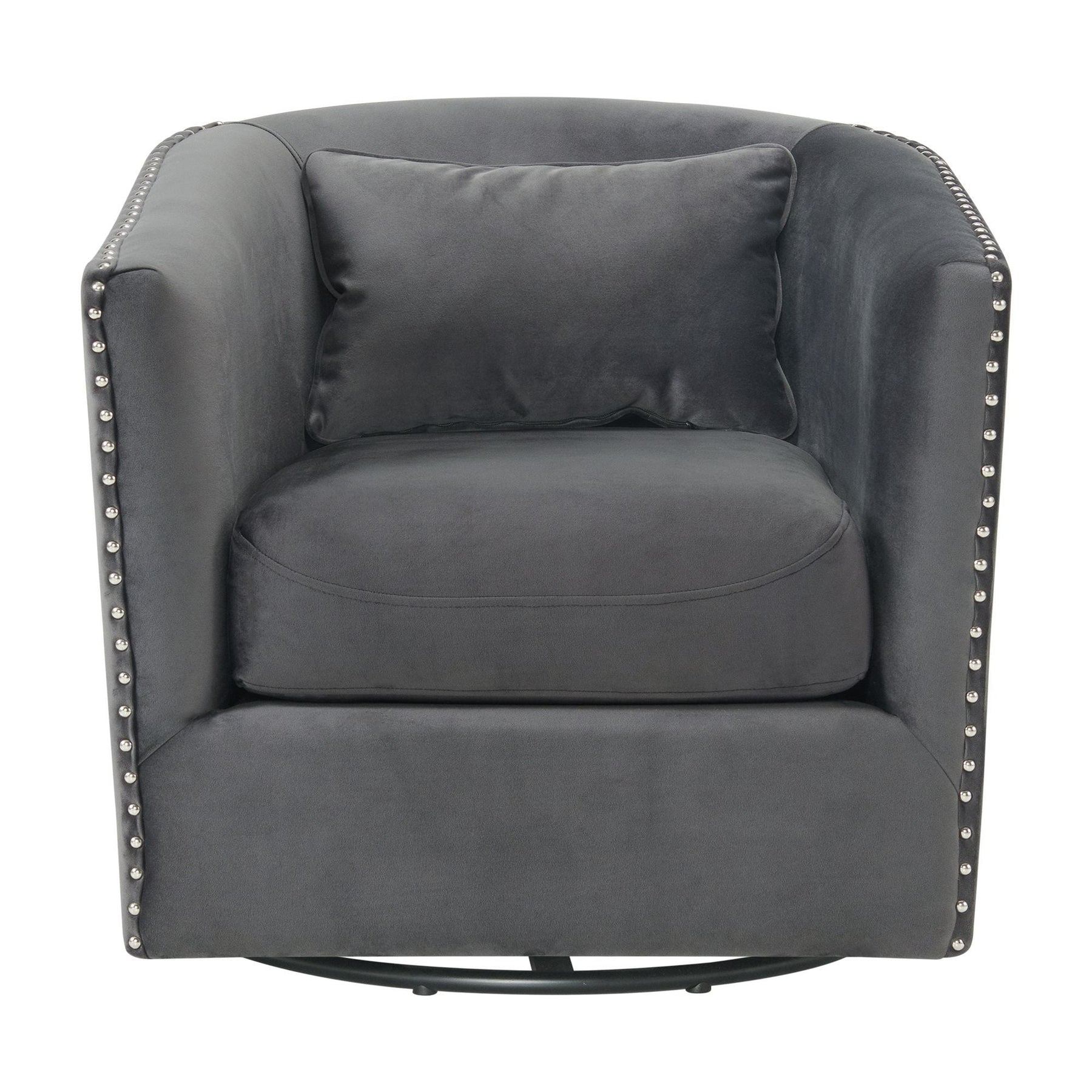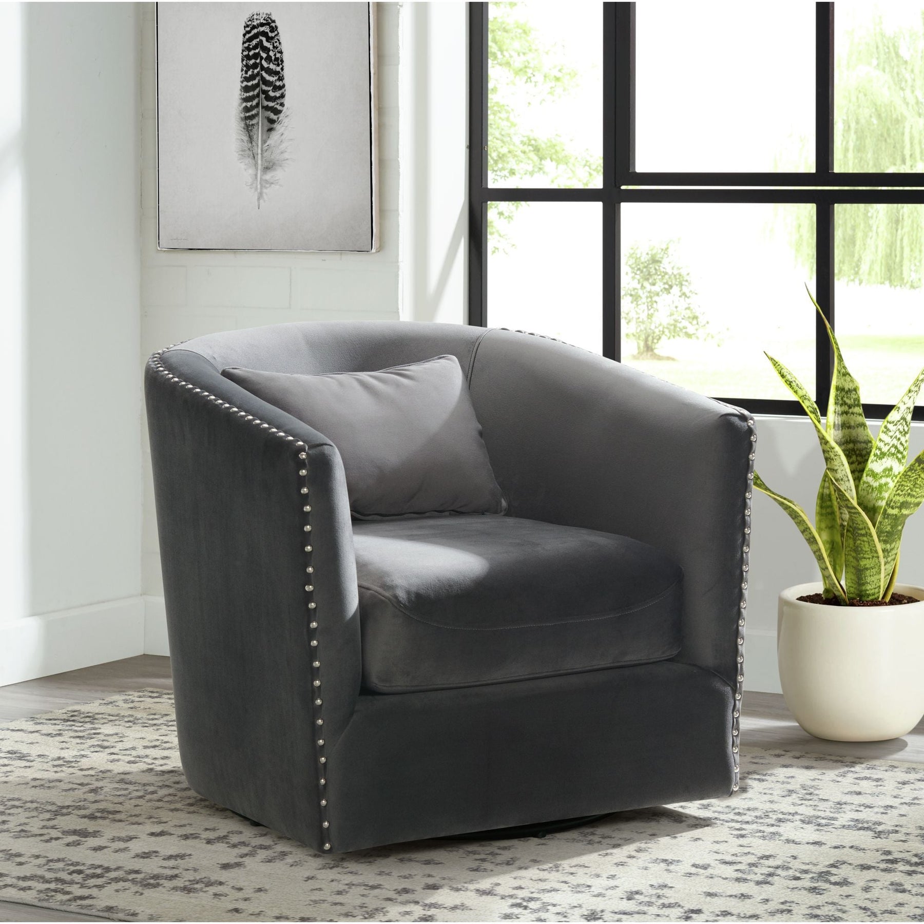 The Stanton Swivel Accent Chair is going to be a knockout in your home! This chair features a thick, seat cushion that is super comfy and will have you never wanting to get out of this chair. Chrome, nail head trim is outlined along the edges of the chair, instantly adding extra flair to this already stylish piece. The chair also comes with one pillow that matches the transitional colors that the chair comes in. Add this swivel accent piece to your home today for a look that will never go out of style!