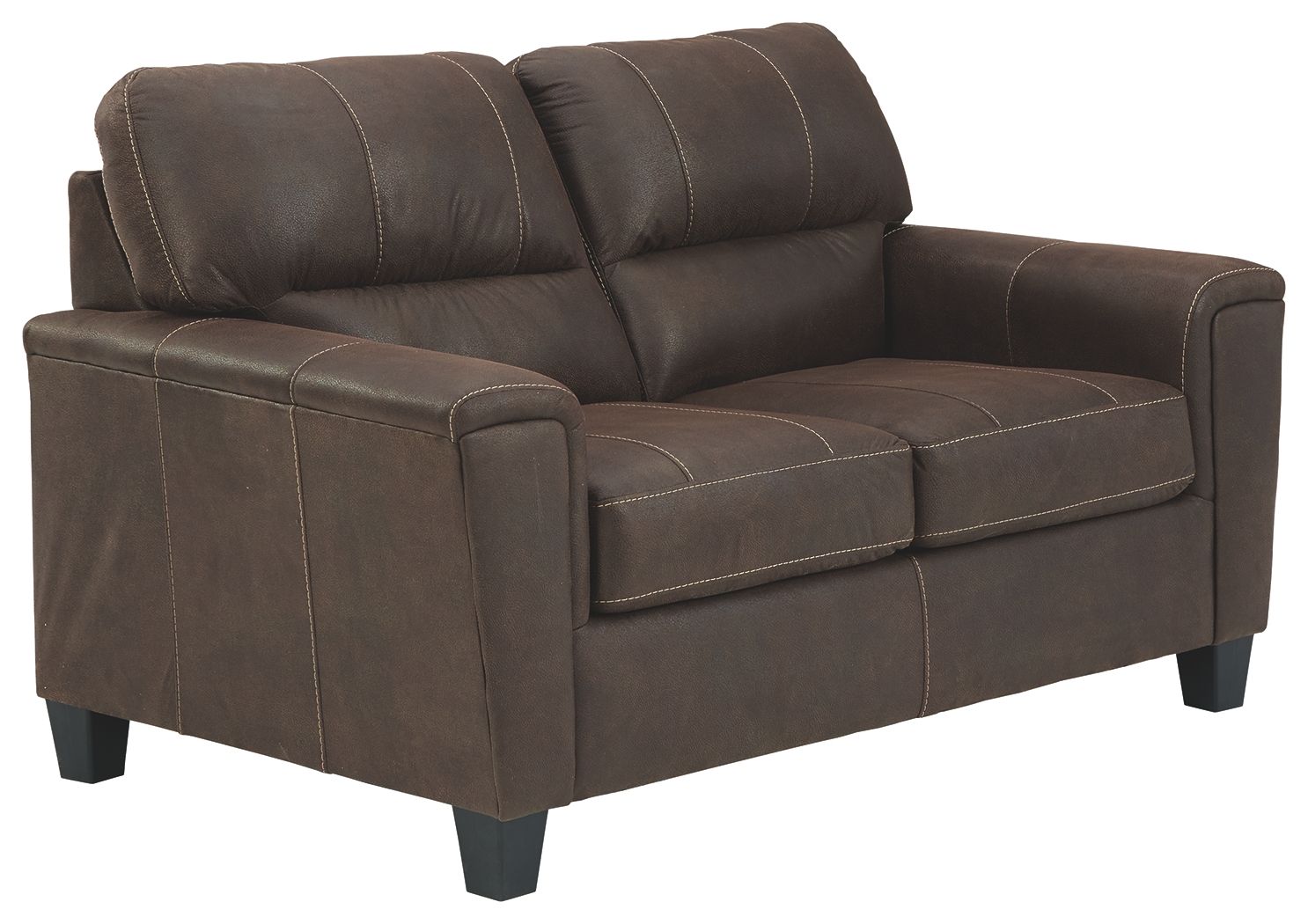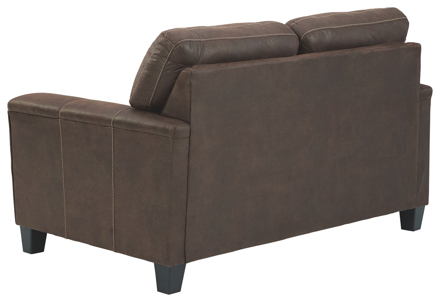 If you love the cool look of leather but long for the warm feel of fabric, you can take comfort in this loveseat. Wrapped in a fabulous faux leather with a weathered hue and hint of pebbly texture to resemble the real deal, this decidedly modern loveseat proves less is more. Elements include angled side profiling and track armrests wrapped with a layer of pillowy softness for that little something extra. Prominent jumbo stitching and clean-lined divided back styling lend fashion-forward flair.
