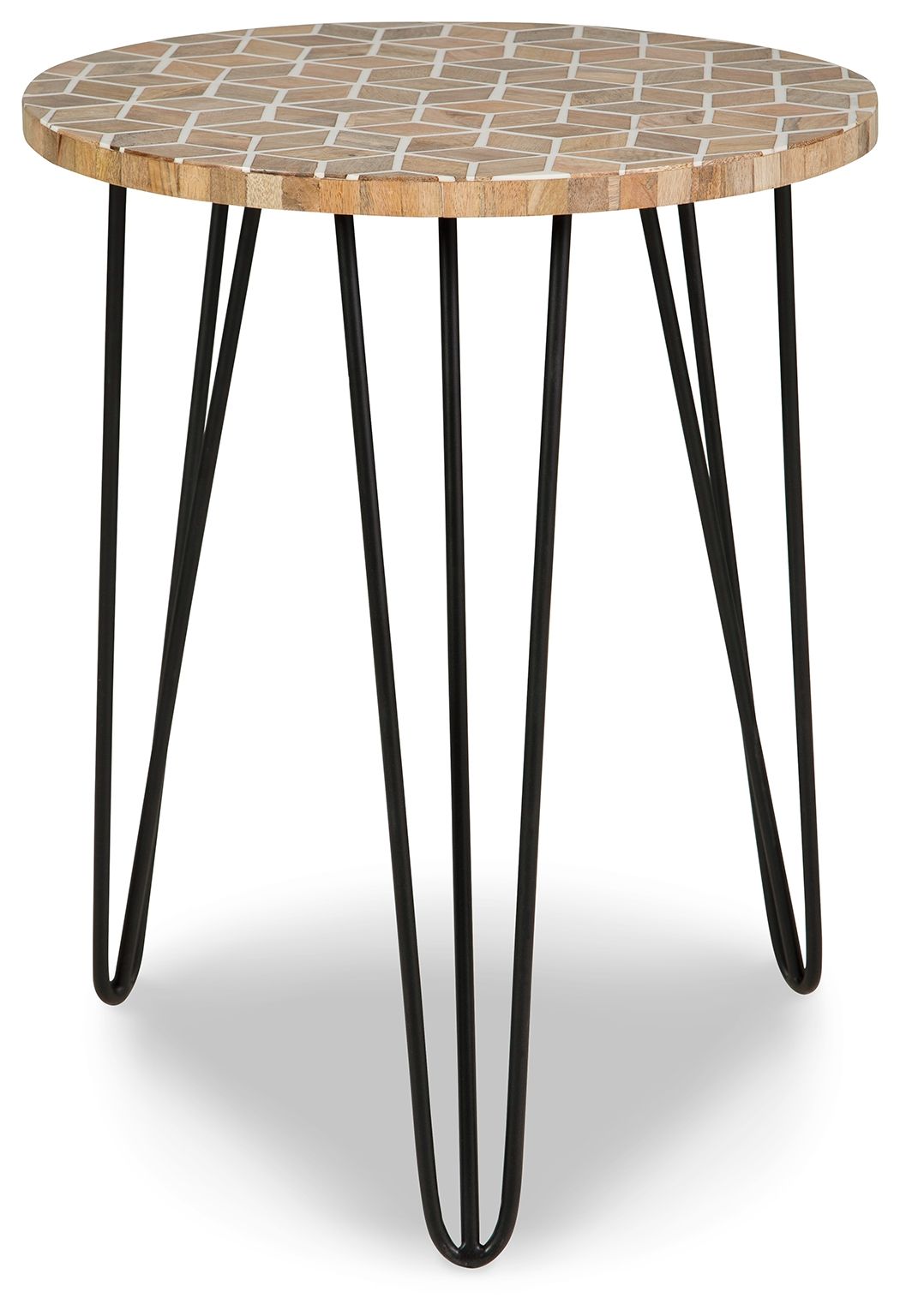 Ground your space with the geometric appeal of this accent table. Both a dynamic decorative accent and a functional surface, the eye-catching design on top is created by combining wood and a white resin inlay. Hairpin legs are a mod touch.