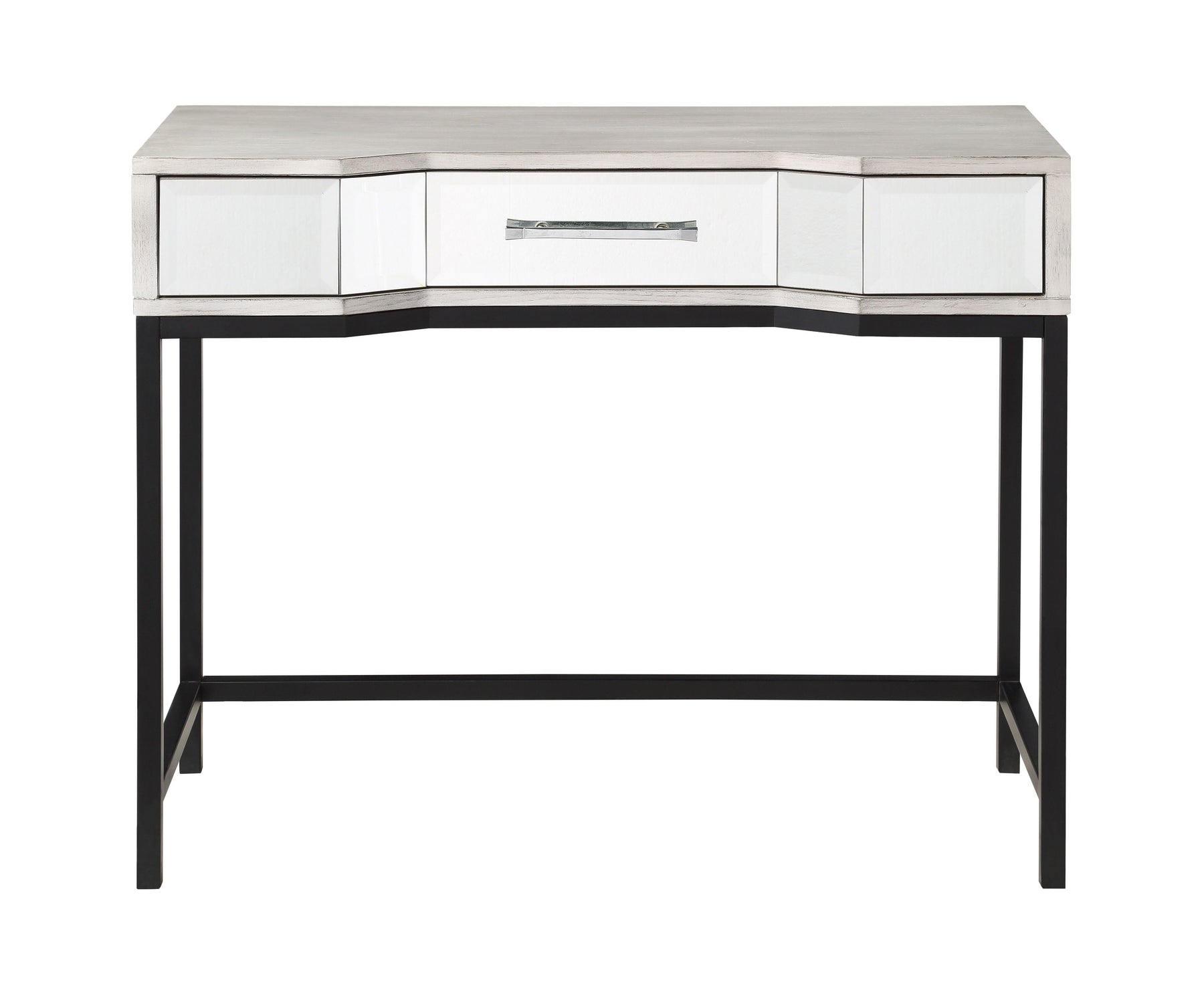 The unique concave front on this Console Table sets it apart from all the rest, for it is fronted with sensational beveled mirrors and pulls out on extended glides to reveal a spacious storage drawer! Resting high upon an open dark metal framework and with a soothing Gabby White finish, this Console will look marvelous in your kitchen or entry, or in your den with the matching Cocktail and End Tables for a most extraordinary decor!