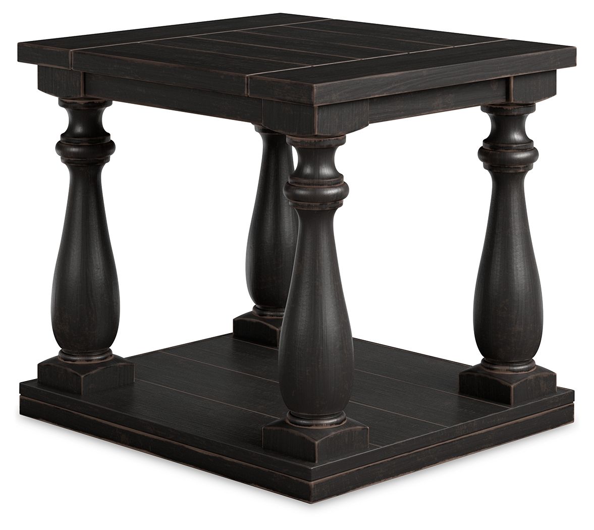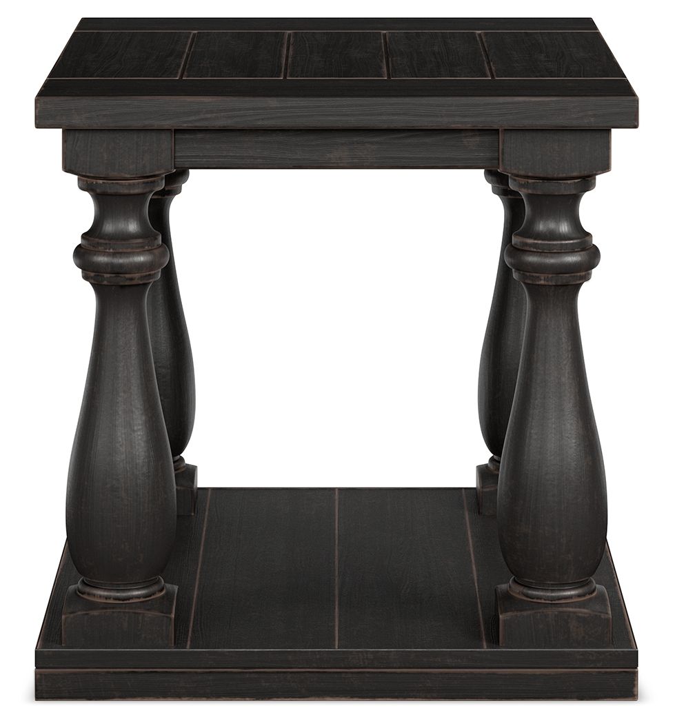 This black end table has a dramatic presence—exactly what an eclectically styled room needs. Solid wood planks and thick veneer merge seamlessly together for a hearty helping of style. Handsomely turned legs connect to a lower shelf flush with the floor. A rustic wirebrush technique gives this stunning square end table in black with show-through contrasting just enough of a weathered sensibility.