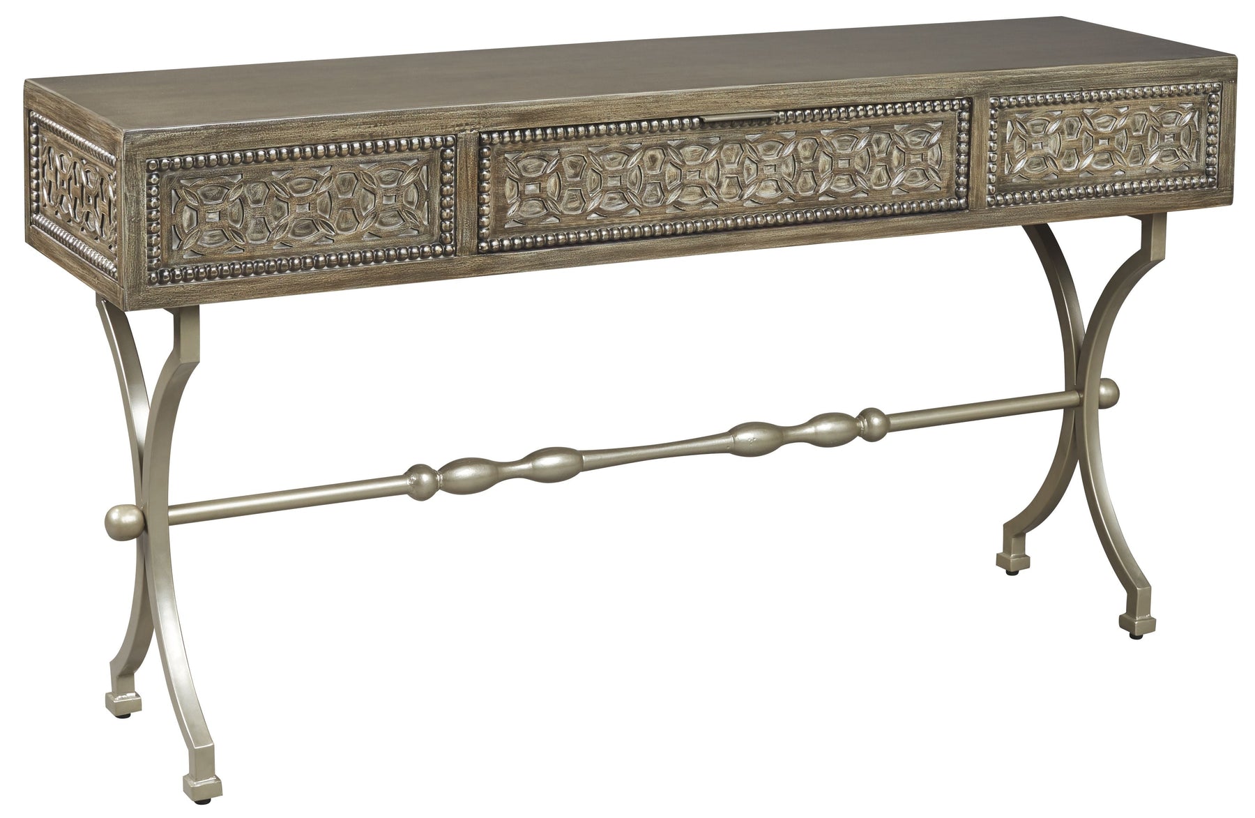 This console sofa table is style with a purpose. This casual look flaunts a medallion pattern along the front. Champagne color finished metal complements the antiqued gray finished wood. Show off decor on top. Rest assured X-base is as strong as it looks. Functional drawer allows you to keep knickknacks out of sight.