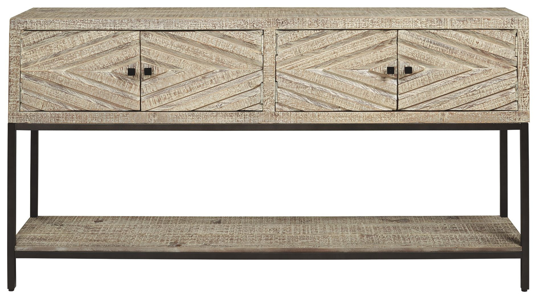 Make a cool, contemporary statement with this console sofa table. Sporting diamond-carved cabinet door fronts with great dimension, this designer piece is an inspired choice for an entryway, dining room or living space. Combination of distressed white wood and black metal is so striking.